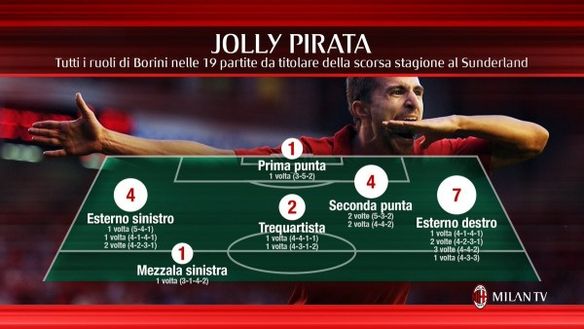 "Il canale tematico rossonero, 'Milan TV', in un'infografica ha spiegato come Borini possa giocare su entrambe le fasce, come esterno d'attacco, da trequartista, da seconda punta, così come da centravanti di manovra. Nella stagione 2016-2017, al Sunderland, in una circostanza ha persino ricoperto il ruolo di mezzala sinistra! Non una stella, molto probabilmente, ma sicuramente un'alternativa utile, duttile e preziosa, che servirà a far rifiatare qualche big in vista dei molteplici impegni che attendono il Milan tra Serie A, Coppa Italia ed Europa League.
