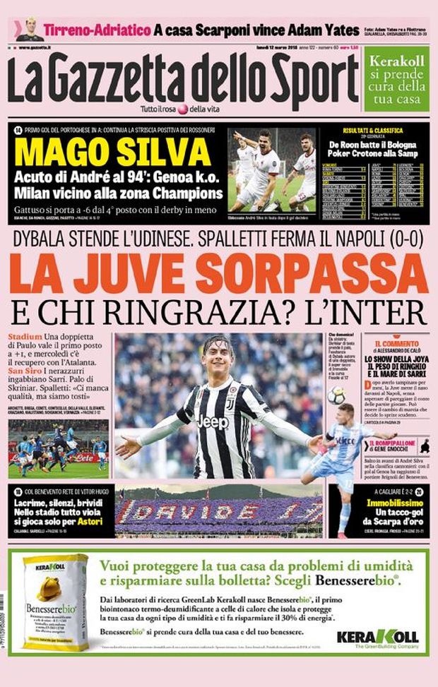 La prima pagina de "La Gazzetta dello Sport" di oggi, 12 marzo, è dedicata al movimento in testa alla classifica. La Juventus infatti batte l'Udinese e sorpassa il Napoli che si ferma sullo 0-0 contro l'Inter. I bianconeri, inoltre, mercoledì devono recuperare la gara con l'Atalanta, quindi sono potenzialmente a +4. In alto spazio al Milan, con il "Mago Silva", che con un gol all'ultimo respiro regala tre punti pesantissimi agli uomini di Gennaro Gattuso, che ora sono a -6 dal quarto posto, con una partita in meno. In basso, invece, ancora spazio al ricordo di Davide Astori: ieri al Franchi in Fiorentina-Benevento si è giocato quasi solo per lui.