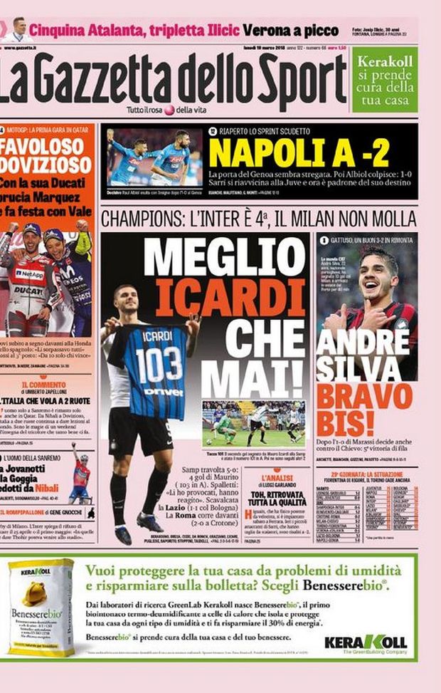 'La Gazzetta dello Sport' oggi in edicola apre con le vittorie delle squadre di Milano nell'ultima giornata di campionato: 5-0 dell'Inter in casa della Sampdoria con quattro reti di Mauro Icardi (giunto a quota 103 gol in Serie A) ed il 3-2 del Milan a San Siro sul Chievo, deciso dal secondo gol consecutivo di André Silva. Un gol di Raúl Albiol, invece, è bastato al Napoli di Maurizio Sarri per avere la meglio sul Genoa e riaprire la lotta Scudetto: ora sono soltanto 2 i punti che dividono i partenopei dalla Juventus.