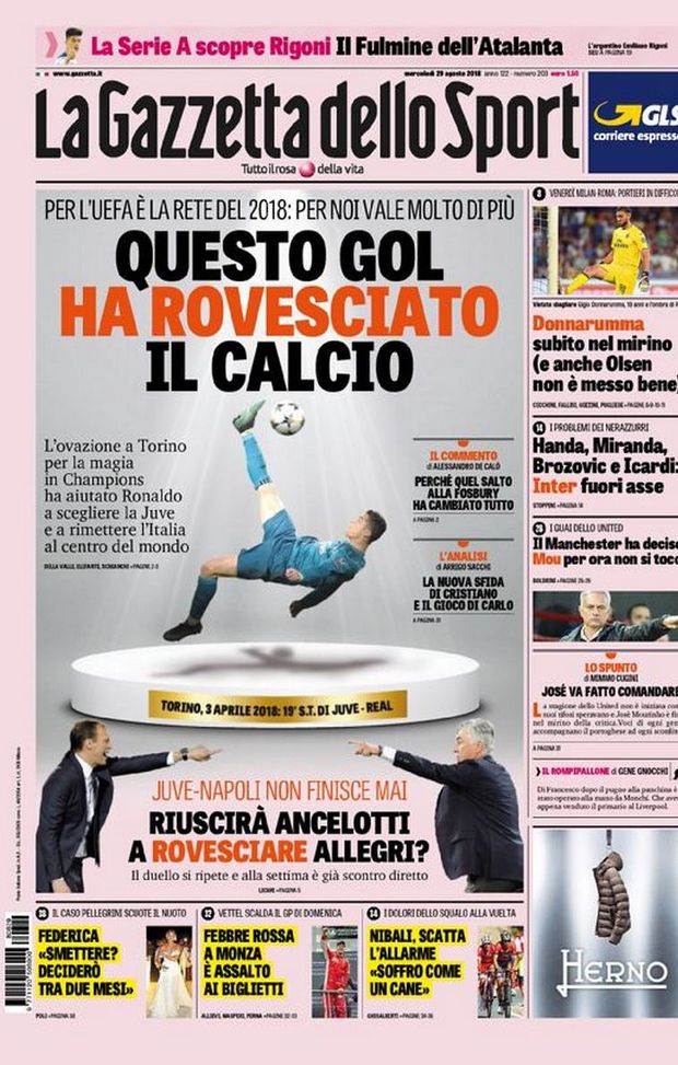 'La Gazzetta dello Sport' oggi in edicola dedica la sua prima pagina al gol più bello del 2018, ovvero quello che Cristiano Ronaldo, ancora con la maglia del Real Madrid, mise a segno all'Allianz Stadium proprio contro la sua futura squadra, la Juventus. Inoltre, spazio per il duello tra i bianconeri ed il Napoli di Carlo Ancelotti per il vertice della Serie A. Nel riquadro verticale, si parla di Milan-Roma, anticipo del venerdì sera con i due portieri, Gianluigi 'Gigio' Donnarumma e Robin Olsen, già nel mirino della critica. Infine, spazio anche all'Inter, alle prese con numerosi problemi in questo avvio di stagione.