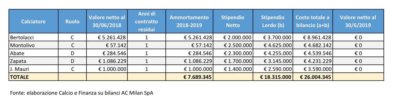 "Nel dettaglio, ha ricordato 'C&F', ieri, domenica 30 giugno, sono scaduti i contratti di Andrea Bertolacci, Riccardo Montolivo, Ignazio Abate, Cristián Zapata e José Mauri: cinque giocatori che nell’ultima stagione hanno messo insieme 3832′ giocati (il più utilizzato del Milan in stagione è stato Franck Kessie con 3625′), di cui 3375′ riferiti ai soli Abate e Zapata.