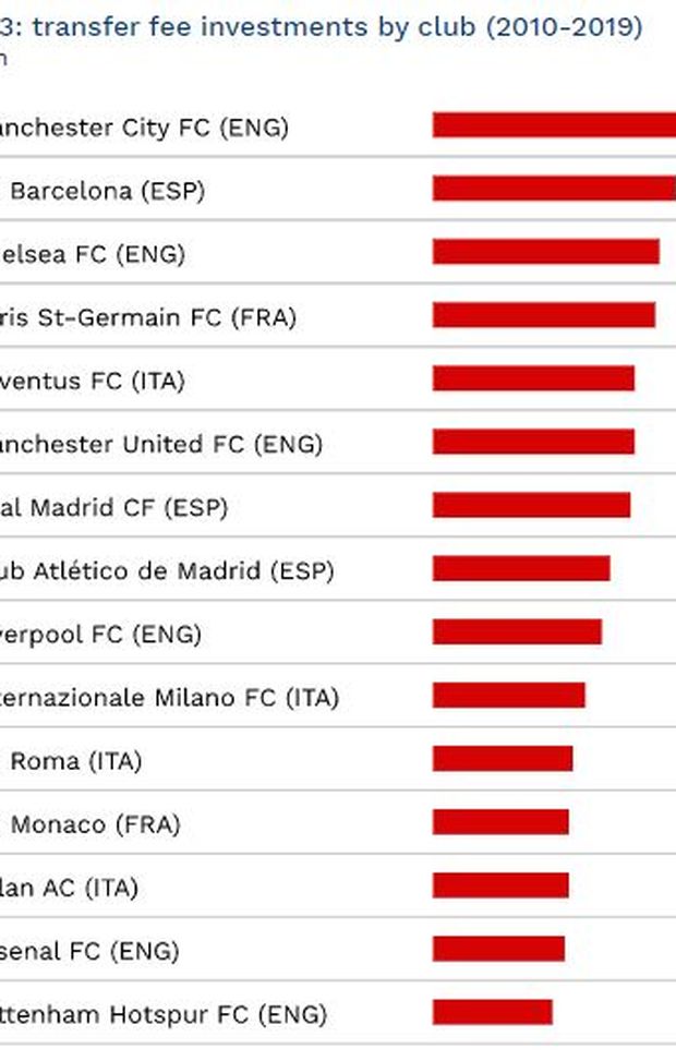 Guida la graduatoria il Manchester City, con 1,638 miliardi di euro investiti, davanti al Barcellona (1,525 miliardi), Chelsea (1,428), PSG (1,392) e alla Juventus che, con 1,272 miliardi di euro spesi sul mercato, è la prima delle italiane presenti in lista, davanti a Inter, in decima posizione con 968 milioni di euro, Roma, undicesima con 895 milioni e Milan, al tredicesimo posto della classifica con 853.