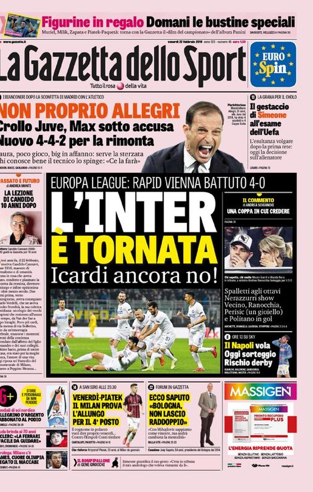 L’ edicola – 22 febbraio 2019: le prime pagine dei quotidiani sportivi