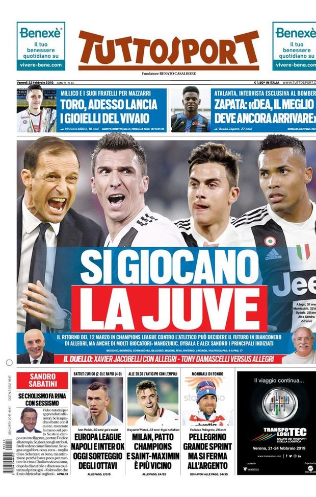 L’ edicola – 22 febbraio 2019: le prime pagine dei quotidiani sportivi