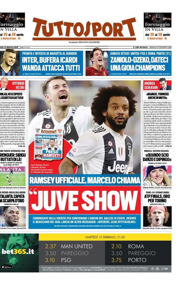 Come di consueto Tuttosport apre a tinte bianconere: "Juve show" è il titolo del quotidiano torinese, che si sofferma sull'acquisto di Ramsey e lancia la bomba Marcelo, che sarebbe stanco di stare al Real Madrid e vorrebbe trasferirsi in bianconero per ritrovare Cristiano Ronaldo. Non c'è spazio per il Milan in copertina.