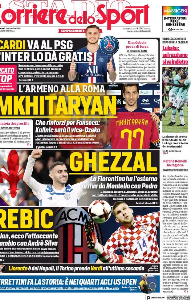 Milan sui media, le prime pagine dei giornali di oggi (03/09/2019)