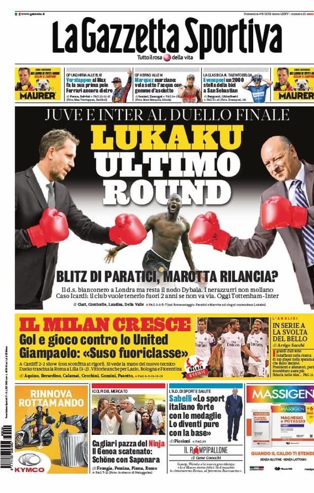Ecco le prime pagine di oggi domenica 4 agosto 2019 de 'La Gazzetta dello Sport', 'Corriere dello Sport' e 'Tuttosport'. In primo piano l'amichevole persa ai calci di rigore per i rossoneri di Marco Giampaolo contro il Manchester United. Altro passo avanti per il Milan che mostra un buon gioco e pareggia 2-2 al termine dei 90 minuti regolamentari.