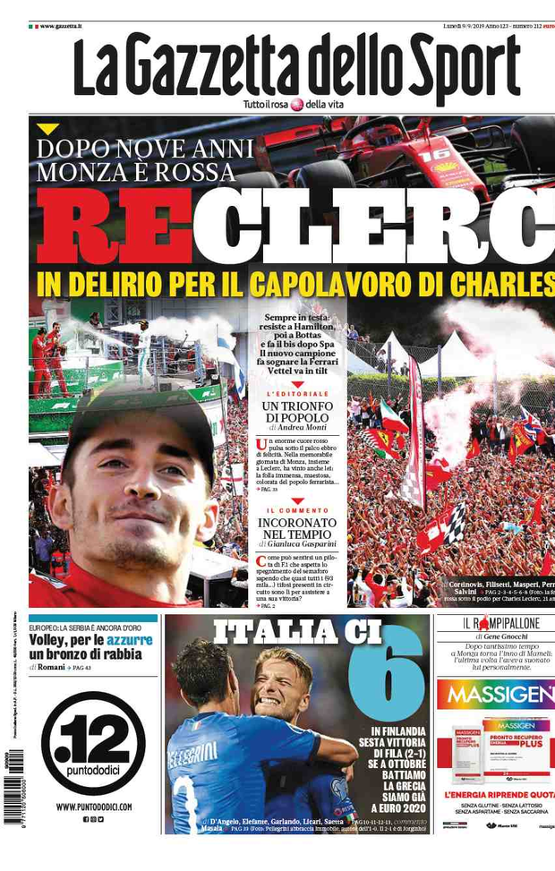Ecco le prime pagine di oggi, lunedì 9 settembre 2019 de 'La Gazzetta dello Sport', 'Corriere dello Sport' e 'Tuttosport'. In primo piano la vittoria dell'Italia in Finlandia per 2-1 grazie alle reti di Immobile e Jorginho: gli Azzurri conquistano il sesto successo in altrettante partite giocate nel girone J. Prime pagine dedicate anche alla vittoria del Gp di Monza dopo 9 anni della Ferrari di Charles Leclerc.