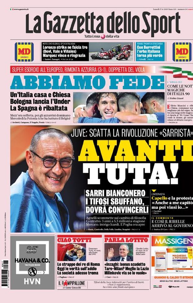 ULTIME MILAN - Ecco le prime pagine di oggi lunedì 17 giugno 2019 de 'La Gazzetta dello Sport', 'Corriere dello Sport' e 'Tuttosport'. In primo piano la vittoria dell'Italia U21 contro la Spagna all'esordio: a Bologna termina 3-1, grazie ad uno straordinario Federico Chiesa che realizza una doppietta e poi al calcio di rigore di Pellegrini. Tanto spazio dedicato anche a Maurizio Sarri che da ieri è ufficialmente il nuovo allenatore della Juventus.
