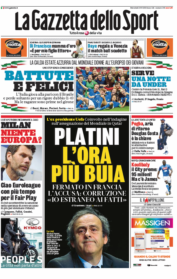 ULTIME MILAN - Ecco le prime pagine di oggi martedì 19 giugno 2019 de 'La Gazzetta dello Sport', 'Corrieredello Sport' e 'Tuttosport'. In primo piano in casa Milan il probabile accordo raggiunto in queste ore con l'Uefa: niente Europa League per i rossoneri, che potranno però avere un anno in più per sistemare i bilanci. L'altra notizia è il fermo di Platini. L'accusa è quella di corruzione per l'assegnazione del mondiale in Qatar. A tra poco per tutta la rassegna, ovviamente in chiave rossonera.