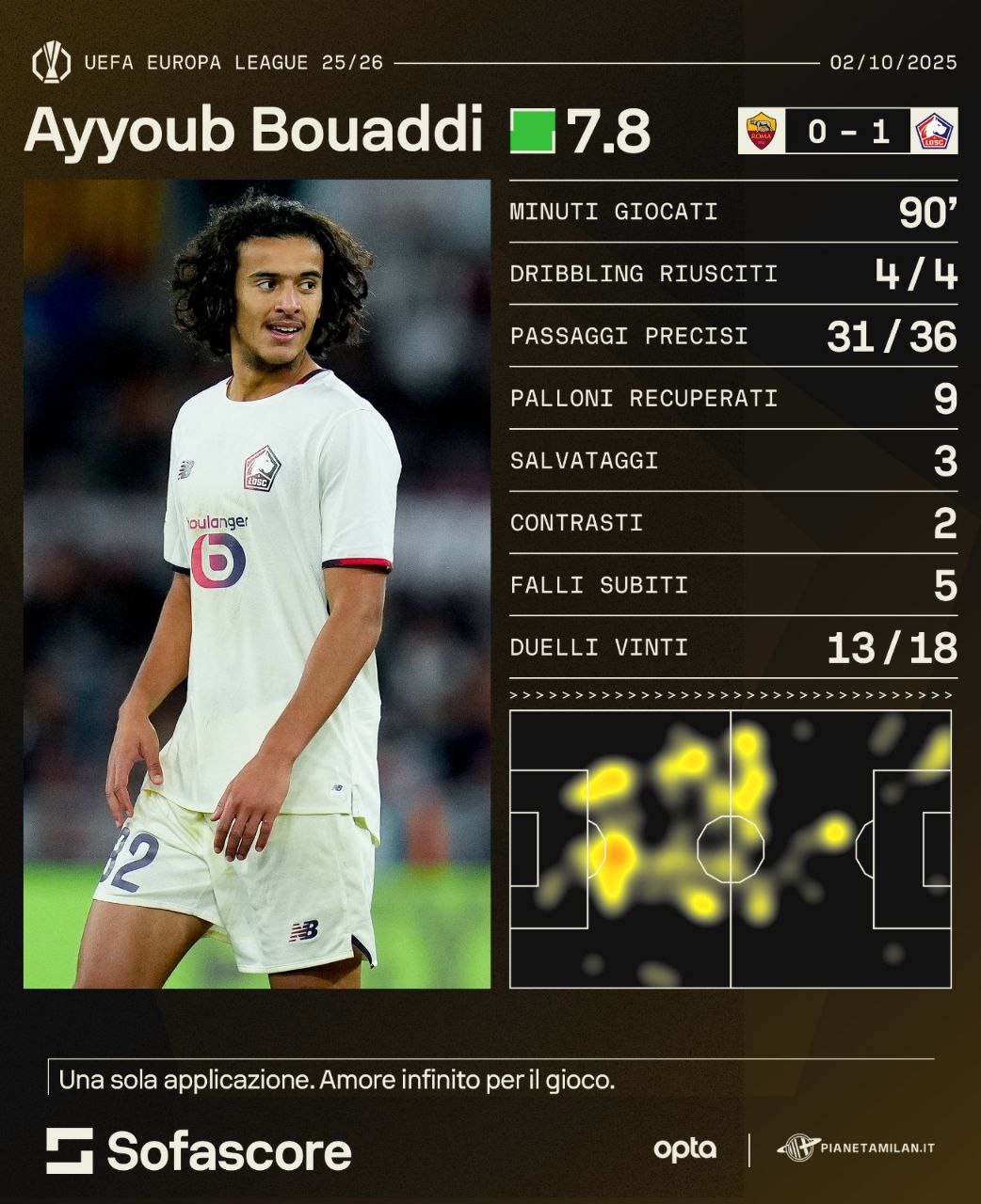 90 minuti in campo con 4 dribbling riusciti su 4. 9 palloni recuperati, 3 salvataggi, 2 contrasti, 5 falli subiti e 13 duelli vinti su 18. Numeri davvero stratosferici e sorprendenti visto che Bouaddi è un classe 2007. Per il Milan potrebbe essere un colpo di calciomercato davvero importante e potrebbe completare del tutto il reparto che a quel punto sarebbe coperto benissimo per presente e futuro.