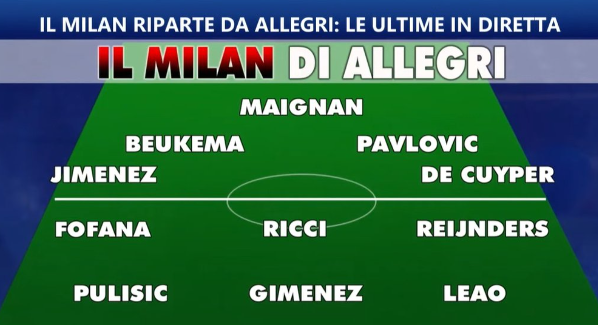 Secondo il canale TV, il Milan di Allegri si schiererà con un 4-3-3: in porta Maignan, difesa con Jimenez, Beukema (del Bologna), Pavlovic e De Cuyper (del Bruges). A centrocampo Fofana, Ricci (del Torino) e Reijnders. In attacco Pulisic, Gimenez e Leao. Da questa immagine, il Milan potrebbe cedere quindi Theo Hernandez e un difensore centrale, a favore di Beukema e De Cuyper. In più l'innesto di Ricci a centrocampo. Vedremo se sarà davvero questo il Milan di Allegri dopo il calciomercato estivo.