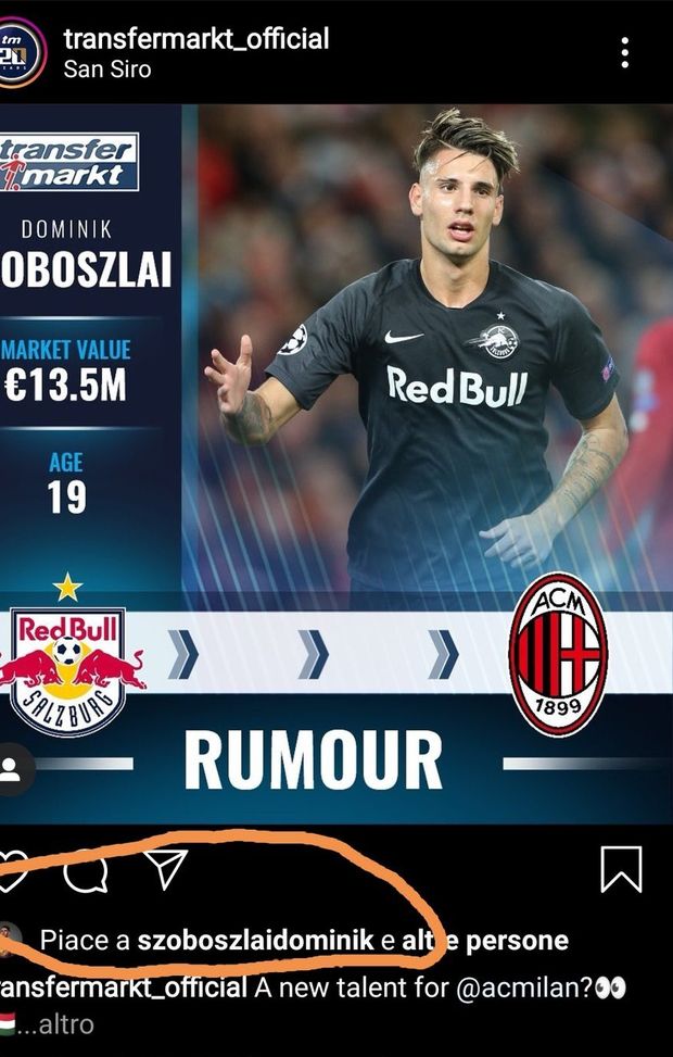 MILAN NEWS - Nuovo like sospetto di Dominik Szoboszlai, talento del Salisburgo accostato con insistenza al Milan della prossima stagione. Per molti l'ungherese, neo calciatore dell'anno del campionato austriaco, è in cima alla lista degli obiettivi di Ralf Rangnick che al Salisburgo lo ha conosciuto molto bene. Il ragazzo sembra apprezzare la destinazione visti i numerosi like che continua a mettere ai rossoneri e i messaggi che si scambia sui social con Rafael Leao (futuri compagni?). Questa volta Szoboszlai ha messo "mi piace" ad una foto su Instagram del sito di mercato Transfermarkt in cui riportava l'indiscrezione di una trasferimento dell'ungherese proprio al Milan. Se non sono segnali questi...