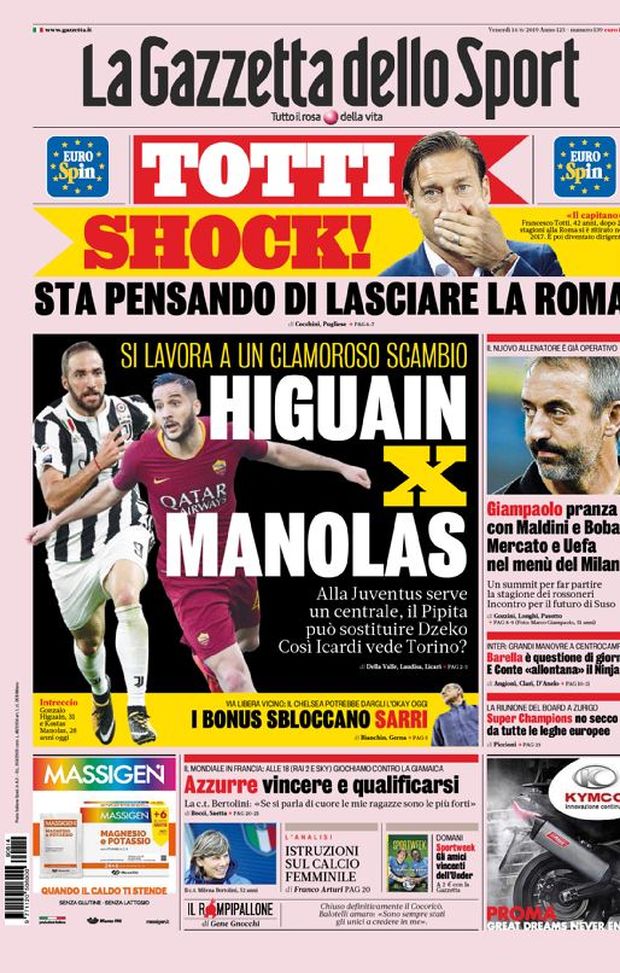 "ULTIME MILAN - 'La Gazzetta dello Sport' apre l'edizione odierna con due notizie bomba: la prima è relativa alla Roma, con Francesco Totti che starebbe pensando di lasciare la società giallorossa. La seconda coinvolge sempre i capitolini, pronti a ricevere in cambio Gonzalo Higuain per lasciare andare, in direzione Juventus, il difensore centrale Kostas Manolas, il quale, però, piace anche al Milan. A proposito dei rossoneri: ieri a Milano pranzo tra Paolo Maldini, Zvonimir Boban e Marco Giampaolo, dove si sono discusse le strategie societarie e di mercato. Dubbi sul futuro milanista di Jesus Suso. In casa Inter, intanto, a giorni sarà formalizzato l'acquisto di Nicolò Barella mentre Antonio Conte vuole fare a meno di Radja Nainggolan. Oggi, intanto, alle ore 18:00, seconda gara dell'Italia Femminile di Milena Bertolini ai Mondiali di categoria: avversaria, la Giamaica.
