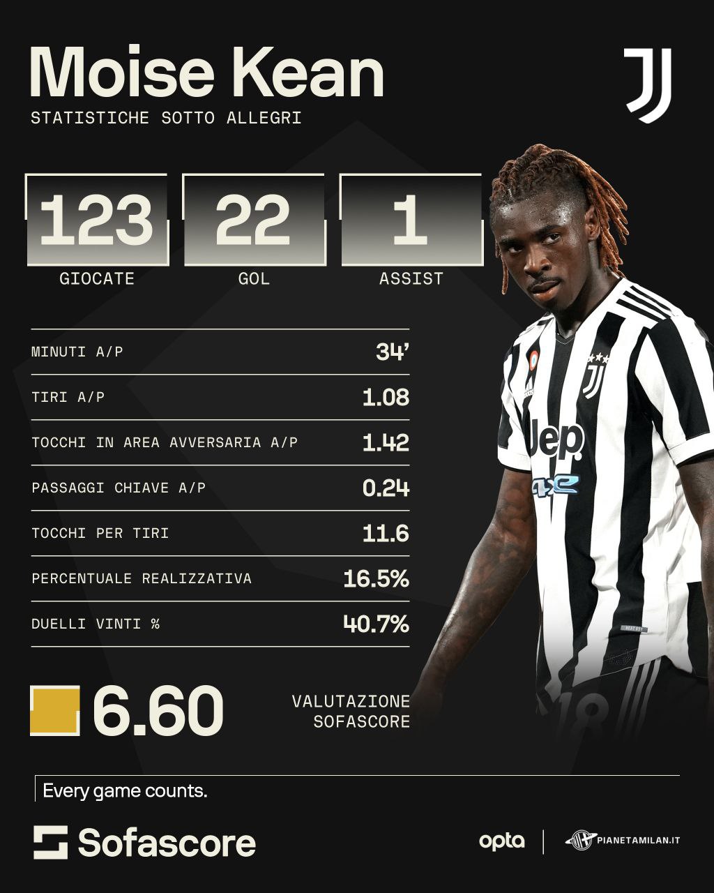 Con Massimiliano Allegri Kean ha giocato 123 partite con 22 gol e 1 assist. 34 minuti a partita con un tiro di media e quasi un tocco e mezzo nelle aree avversarie. 11 tocchi per un tiro e una percentuale realizzativa del 16% con un 40% di duelli vinti. Numeri non esaltanti per una prima punta, ma ci sono dei fattori da considerare: nella prima avventura di Kean alla Juventus l'attaccante italiano era ancora giovanissimo e inesperto, mentre nella seconda avventura non era certo una primissima scelta per Allegri. Dal suo passaggio alla Fiorentina ha avuto un miglioramento quasi esponenziale nonostante le difficoltà in questa stagione che sono anche dovute alle difficoltà generali della Viola.