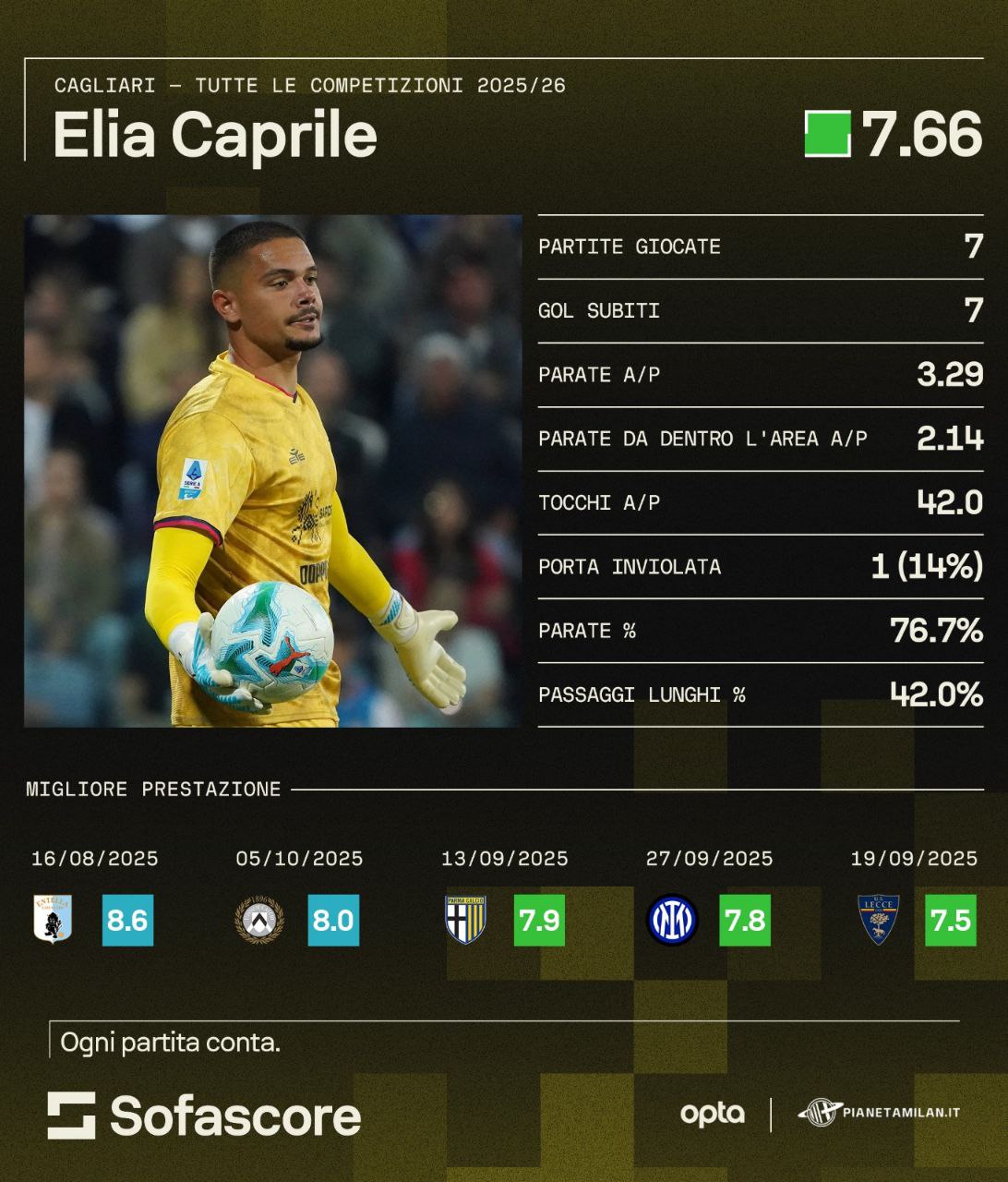 Per Caprile 7 partite giocate in stagione con solo 7 gol subiti e una media di più di tre parate a partite. Con poco più di due di queste arrivate da tiri effettuati in area di rigore. 42 tocchi partita con una sola porta inviolata in stagione. 76% di parate e 42% di passaggi lunghi. Sofascore riporta le migliori prestazioni in stagione e il voto più basso è 7,5. Un inizio di stagione stratosferico per Caprile. Non è solo in questa stagione, Caprile sta giocando a grandi livelli già da qualche anno con i sardi. Guardiamo qualche miracolo, ad esempio contro l'Udinese dove ha tenuto in piede il suo Cagliari. Ecco il video.