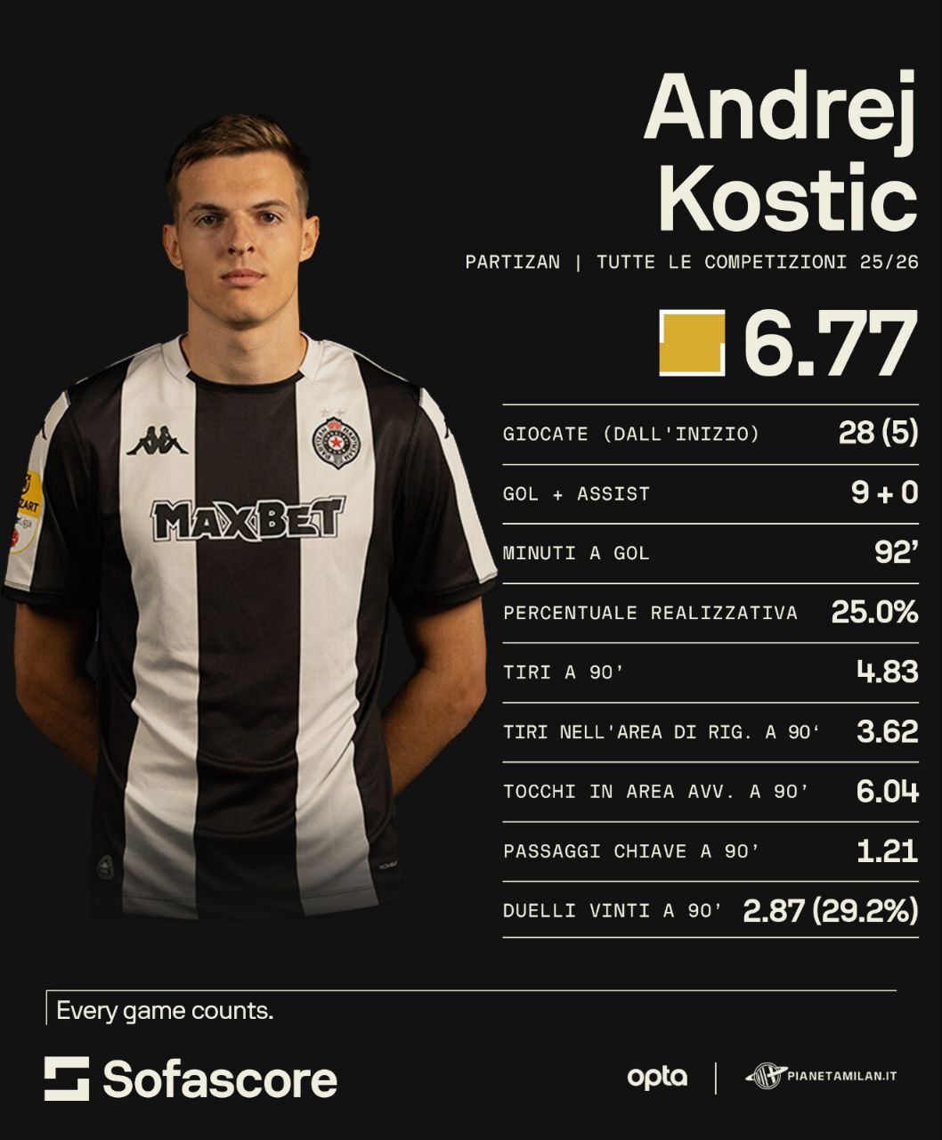 Il Milan continua con il suo lavoro per il presente e per il futuro dell'attacco. A gennaio il club ha chiuso per Fullkrug, ma in estate potrebbe cambiare molto. Come detto occhi anche su talenti interessanti per le prospettive del club rossonero. Tra questi ci potrebbe essere il classe 2007 Andrej Kostic. Il giocatore è stato cercato durante tutto il mese di gennaio, ma il Milan potrebbe cercare l'accordo con il Partizan Belgrado in questi mesi in vista del calciomercato estivo. Come gioca Kostic? Fisico molto imponente nonostante la giovane età (alto un metro e novanta): ha nelle sue armi un tiro molto potente e secco. Può essere pericoloso sia fuori che dentro l'area di rigore. A livello fisico è già strutturato e pronto anche per un campionato come la Serie A. Può segnare in tutto modi e sa farlo anche in area di rigore. Bene anche di testa. Sa usare bene entrambi i piedi. Noi di Pianeta Milan abbiamo analizzato i suoi numeri.