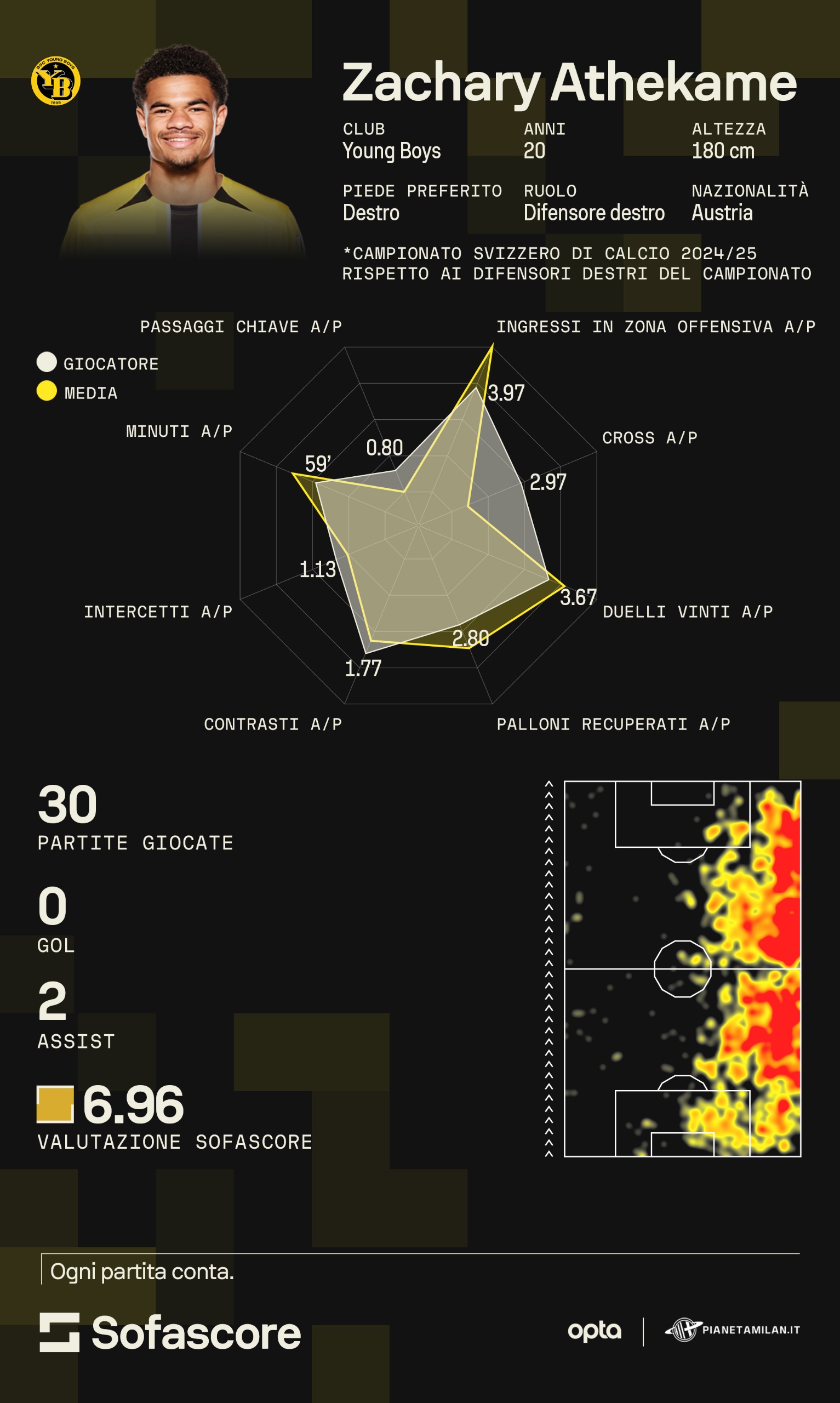 Per curiosità abbiamo dunque chiesto un confronto con la media dei terzini destri della Super League svizzera nei vari dati e, da quanto si evince, Zachary Athekame è stato sopra il livello della prima lega elvetica in quattro elementi in particolare. Innanzitutto gli ingressi in zona offensiva, ma anche in duelli vinti e in palloni recuperati, oltre ai minuti disputati a partita, che danno il senso della sua resistenza. Ora, questo significa che i colleghi di 'Blick' hanno senza dubbio ragione, ma ci permettiamo di fare una considerazione. Che il classe 2004 sia il migliore nel suo ruolo nel campionato in questione non lo mettiamo in dubbio, ma il livello della lega è quello che è. Non è il numero uno ne La Liga o in Premier League e questo è un elemento che deve non può essere sottovalutato.