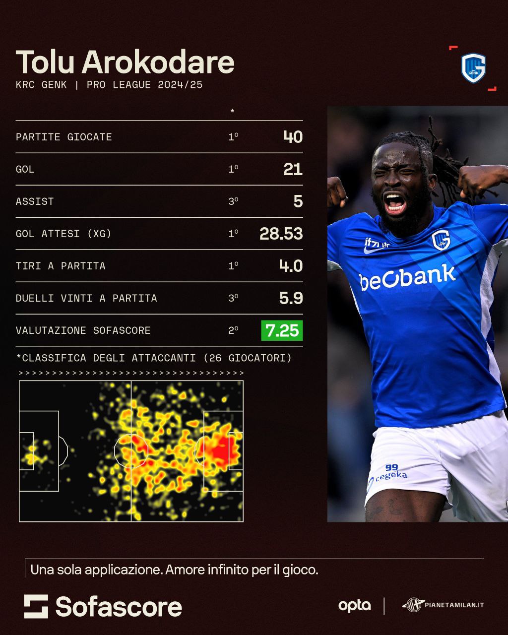 Andiamo a vedere i numeri e le statistiche grazie 'SofaScore' e 'Opta' per PianetaMilan. L'attaccante ha giocato 40 partite in stagione con la squadra belga con 21 gol e 5 assist. XG totale di quasi 29 quindi non troppo distanti dai 21 messi realmente a segno. 4 tiri a partita e praticamente 6 duelli vinti di media. Il dato forse più interessante arriva dalla heatmap: come possiamo vedere, Arokodare è un'attaccante che gioca spessissimo in area di rigore. Quello che starebbe cercando il Milan di Allegri.