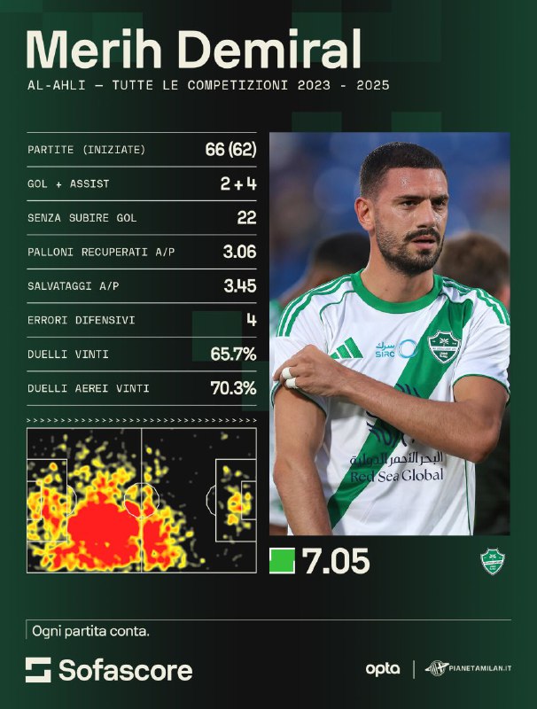 Andiamo a vedere i numeri del difensore grazie alle statistiche di 'SofaScore' e 'Opta' per PianetaMilan. Demiral ha giocato 66 partite con l'Al-Ahli di cui 62 da titolare. 2 gol e 4 assist e tante partite senza subire gol: 22. Tre palloni recuperati a partite, mentre sono poco più di tre i salvataggi di media. Solo 4 errori difensivi con ottime percentuali sui duelli vinti (65%) e sui duelli aerei vinti (70%). Numeri molto importanti quelli per Demiral, che non ha perso il passo durante la sua avventura lontano dalla Serie A. Per il Milan potrebbe essere un colpo molto importante per vari motivi: classe 98, quindi ancora nel pieno della carriera, potrebbe essere un'occasione, visto il contratto in scadenza nel 2026. Secondo transfermarkt, il suo valore sarebbe di 13 milioni di euro, ma potrebbe arrivare a prezzo di saldo visto che è in scadenza. Da superare lo scoglio ingaggio visto che secondo Eurosport prende 13 milioni a stagione.