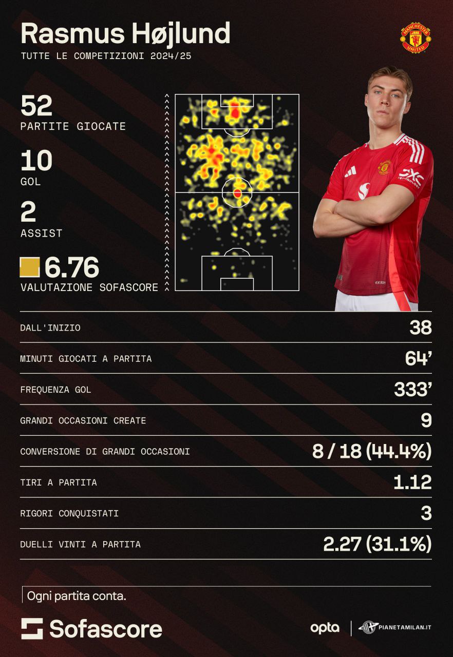 Per il danese 10 gol e due assist. Come detto, i numeri offensivi non vanno proprio a suo favore: il Milan starebbe cercando una prima punta d'area di rigore, un giocatore in grado di segnare con costanza e cinismo. Hojlund, almeno analizzando questi numeri, non sembrerebbe essere la punta giusta per le esigenze rossonere.