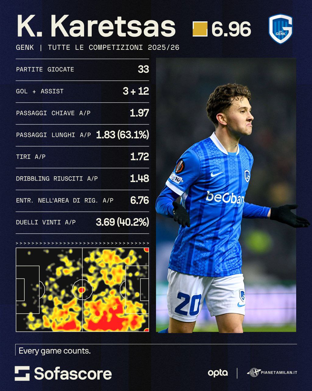 Il Milan continua la sua ricerca di talento in giro per il mondo. Il club rossonero, infatti, potrebbe investire ancora in estate dopo colpi importanti in prospettiva a gennaio. Tra questi ci potrebbe essere il classe 2007 Konstantinos Karetsas , fantasista del Genk. Secondo 'La Gazzetta dello Sport', il prezzo di Karetsas potrebbe essere di circa 25 milioni di euro, e il Diavolo lo avrebbe già seguito dal vivo con alcuni scout. Come gioca Karetsas? Il giovane greco è un fantasista che dà del tu al pallone, sa trovare i compagni benissimo ed è in grado di saltare l'uomo in dribbling. Ha un'intelligenza calcistica molto alta e un tiro già maturo. Sa tirare bene e forte anche da lontano e con entrambi i piedi. Noi di Pianeta Milan abbiamo analizzato i suoi numeri stagionali e non solo.
