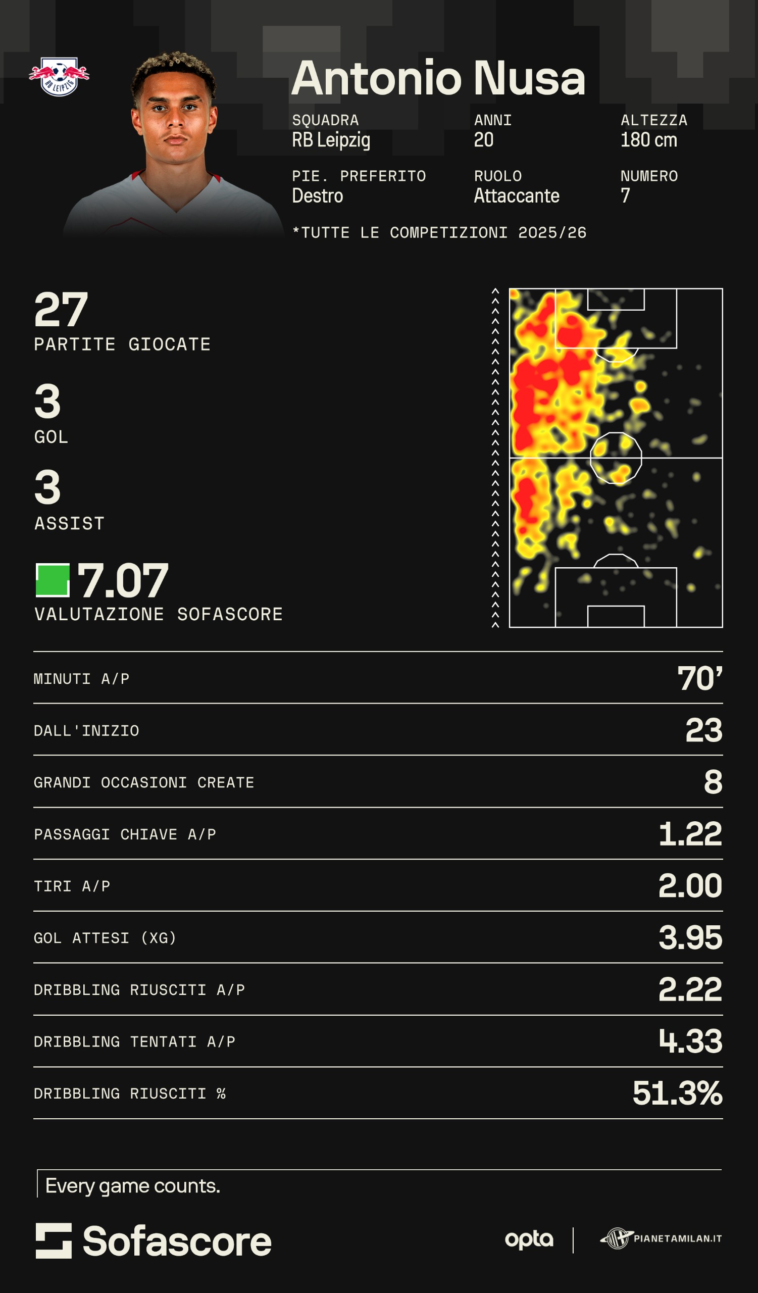 Nusa ha giocato 27 partite in stagione con la maglia del Lipsia con 3 gol e 3 assist. Come possiamo vedere dalla sua heatmap è un esterno sinistro purissimo ed è anche più piccolo di Leao non solo per l'età (20 anni), ma anche per la stazza: il norvegese è alto 180 centimetri. Nusa è un titolare dei tedeschi visto che gioca 70 minuti di media a partita ed è partito dal primo minuto in 23 partite. 8 grandi occasioni create con poco più di un passaggio chiave a partita e 2 tiri di media. Numeri abbastanza bassi per essere un esterno come sono bassi gli XG in generale: quasi 4. Dribbling riusciti poco più di 2 di media con poco più di 4 tentati per un 51% di riuscita.