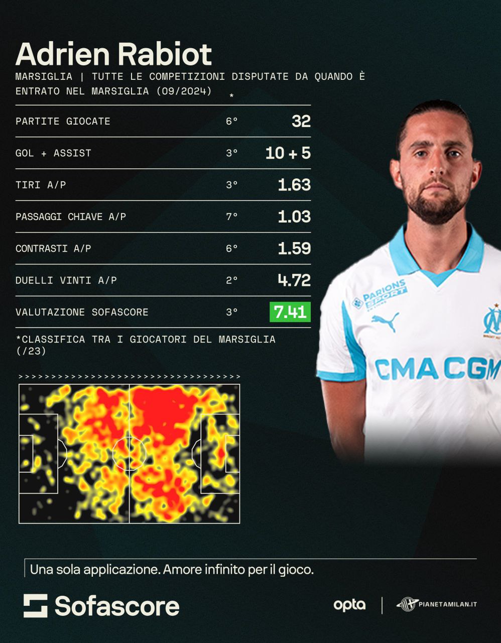 Andiamo a vedere i numeri del centrocampista grazie alle statistiche di 'SofaScore' e 'Opta' per PianetaMilan. Per Rabiot sono 32 partite con 15 partecipazioni al gol (10 reti e 5 assist). In pratica quasi un gol o un assist ogni due partite. Quasi due tiri di media, un passaggio chiave di media. Pochi contrasti, ma quasi 5 duelli vinti di media. Dalla heatmap possiamo vedere come Rabiot abbia giocato a tutto campo con anche ampia presenza nell'area di rigore avversaria.