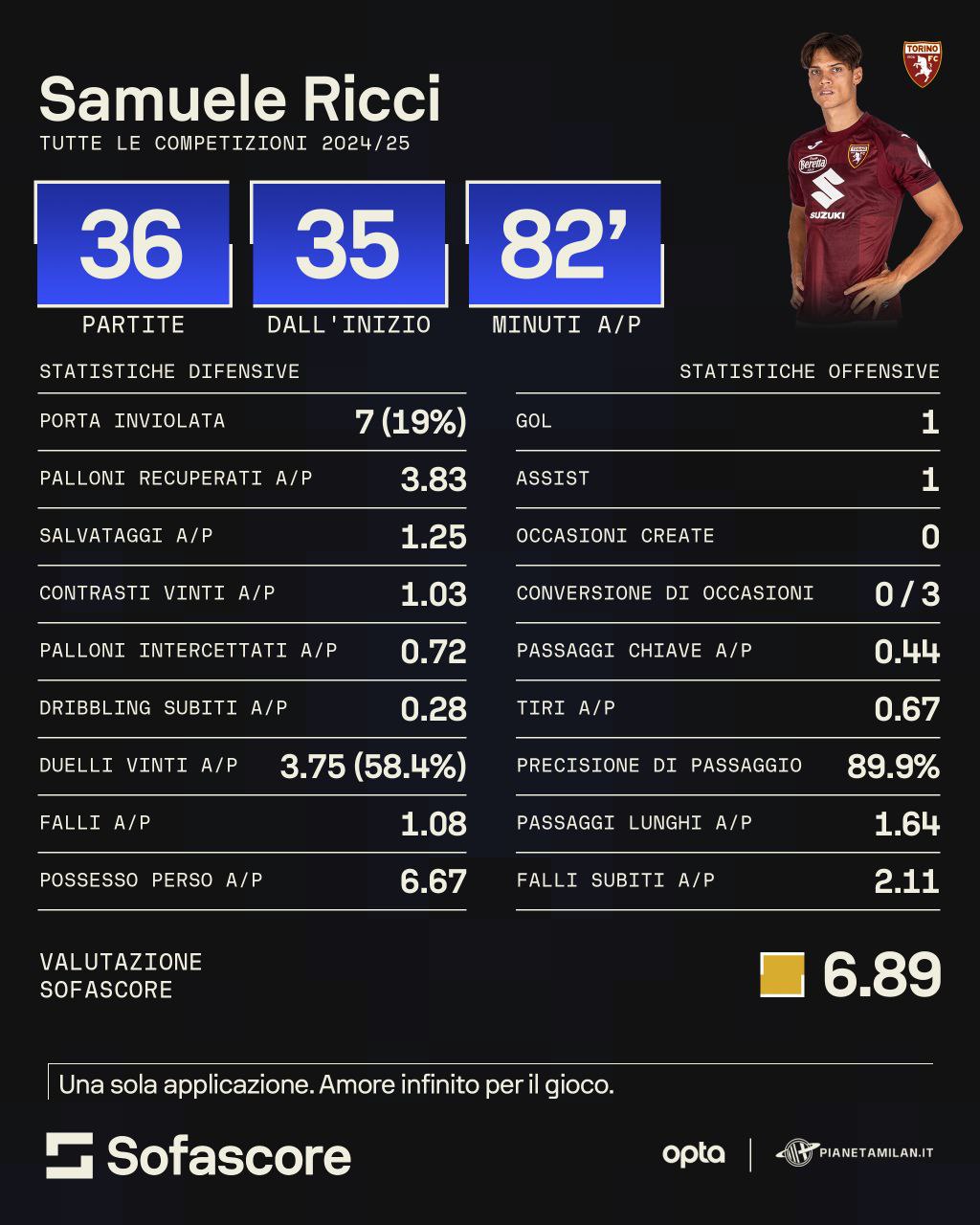 Ecco le prestazioni stagionali del centrocampista grazie ai numeri e alle statistiche di 'Opta' e 'Sofascore' per PianetaMilan. Ricci ha giocato 36 partite una sola dalla panchina con 82 minuti a partita, praticamente non veniva quasi mai tolto dal campo. Partiamo dai numeri offensivi che sono meno interessanti: un gol, un assist, zero occasioni create e meno di mezzo passaggio chiave a partita. Anche i tiri di media sono inferiori a uno, mentre la precisione sui passaggi sfiora il 90 percento. Più di due falli subiti a partita e 1.64 passaggi lunghi a partita. Numeri molto più importanti in difesa: con lui 7 porte inviolate con quasi 4 palloni recuperati a partita e più di un salvataggio di media, così come i contrasti. I duelli vinti sono quasi 4 a partita e i possessi persi sfiorano i 7 di media.