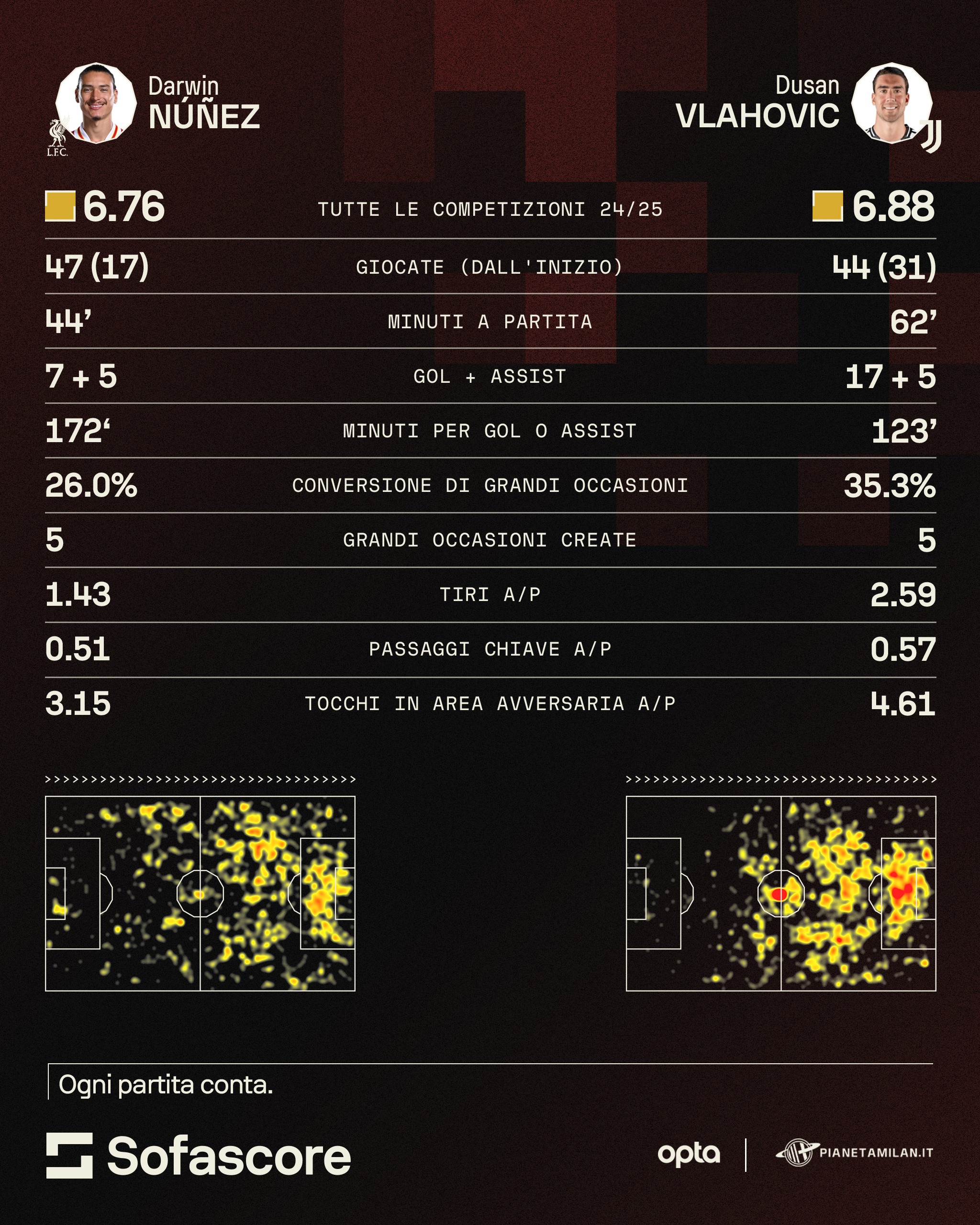 Per risolvere questo dubbio ci siamo fatti aiutare dai colleghi di 'Sofascore' per una grafica di confronto, dalla quale emerge un paragone davvero impari. L'uruguaiano, in tutte le competizioni, ha giocato tre partite in più rispetto al serbo. Eppure i suoi numeri sono peggiori in tutto, a partire dalla combo gol+assist (17+5 per Dusan Vlahovic, 7+5 per Darwin Nunez. Interessante anche il dato sulla conversioni delle grandi occasioni (35,3% vs 26%), a fronte delle 5 create da entrambi. L'attaccante della Juventus è avanti anche nei tiri a partita (2.59 a 1.43), nei passaggi chiave a partita (0.57 a 0.51) e i tocchi nell'area avversaria (4.61 a 3.15).
