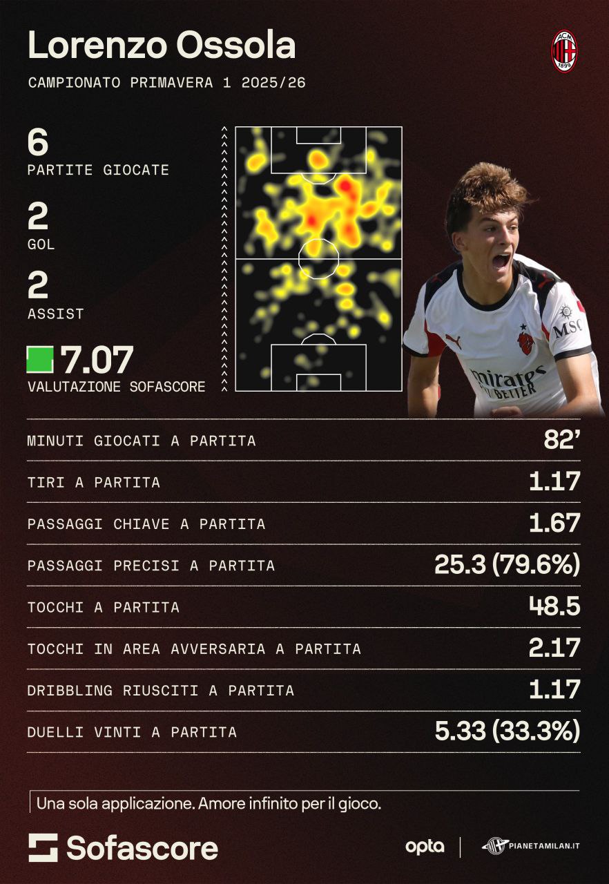 Un grande inizio di stagione per Lorenzo Ossola che ha giocato 6 partita con il Milan Primavera segnando 2 gol e servendo due assist. 82 minuti di media a partita con più di un tiro e più di un passaggio chiave di media. Ottima la percentuali dei passaggi precisi riusciti con quasi l'80%. Quasi 50 tocchi a partita di cui poco più di 2 di media nell'area di rigore avversaria. Un dribbling riuscito di meda e il 33% di duelli vinti. Contro il Cagliari è stato quasi dominante, questa la nostra pagelle: "Si muove tra le linee con eleganza e classe: sembrerebbe già pronto per giocare a un livello superiore. Piede educato, tanta mobilità. Si guadagna e conquista, al 54', il calcio di rigore che sblocca il risultato. Poi, al 62', di tacco, serve a Castiello l'assist per il raddoppio rossonero. It's a kind of magic. Voto 8".