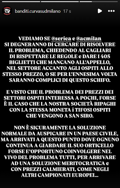 "Il Cagliari Calcio doveva mettere a disposizione 820 biglietti per gli ospiti come da delibera della Lega Serie A e invece come accade in deroga da anni ne concede solo 415, con gente che ha già comprato voli, spendendo centinaia di euro che è rimasta puntualmente senza biglietto. A questo schifo va aggiunto il costo di 49€ contro i 25€ delle curve di casa, per uno stadio costruito con i tubi delle impalcature dei cantieri... Ulteriore beffa oltre al fatto di avere ben 405 biglietti in meno rispetto al dovuto, il costo del settore accanto alla modica cifra di 120€...E IL MILAN SUBISCE COME SEMPRE PASSIVAMENTE SENZA BATTERE CIGLIO...". Altro post sempre sul caos biglietti in trasferta. Ecco il post.