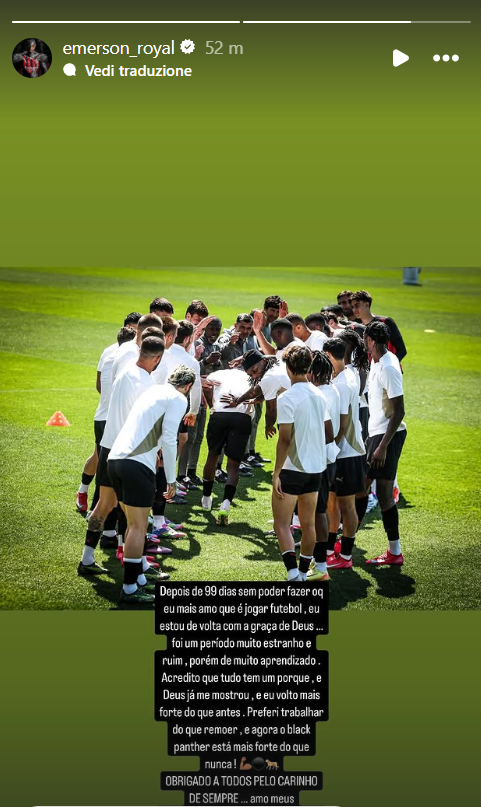 Milan, Emerson Royal è arrivato in estato dal Tottenham ed è stato il titolare praticamente fisso di Fonseca e anche di Conceicao fino al mese di gennaio, quando i rossoneri hanno acquistato Kyle Walker per la fascia destra e il brasiliano si è fermato. Il terzino si è procurato una lesione al polpaccio importante contro il Girona il 22 gennaio 2025. Oggi, 2 maggio 2025, il terzino brasiliano è tornato a lavorare con il gruppo. Ecco il suo messaggio sui social.