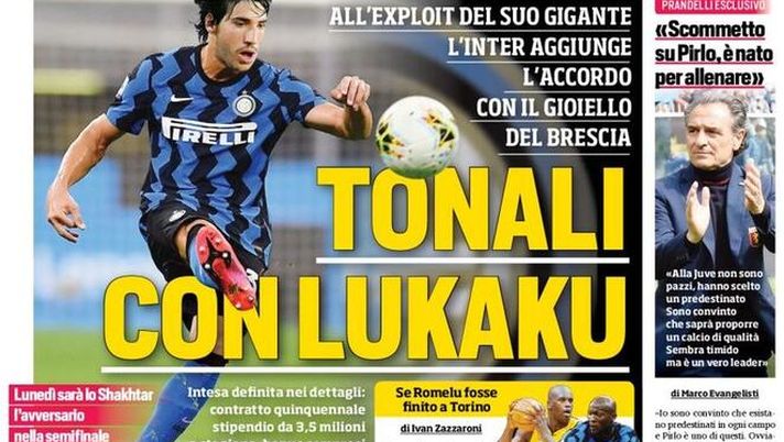 "Il 'Corriere dello Sport' dedica la sua copertina al calciomercato dell'Inter: accordo con Sandro Tonali sulla base di un contratto da 3,5 milioni di euro netti a stagione fino al 30 giugno 2025; al Brescia, che aspetta le mosse dell'amministratore delegato nerazzurro Giuseppe Marotta, dovrebbero andare 35 milioni di euro, di cui 10 subito e 25 tra un anno. Tonali raggiungerà all'Inter, dunque, l'uomo del momento, Romelu Lukaku?