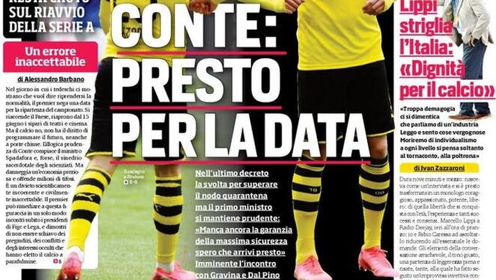 In primo piano viene riportata la ripresa della Bundesliga dopo lo stop forzato causato dall'emergenza coronavirus. In basso a sinistra, per quanto riguarda il Milan, c'è la notizia di un nuovo interesse del Bologna per Zlatan Ibrahimovic, dopo il tentativo fallito a gennaio.