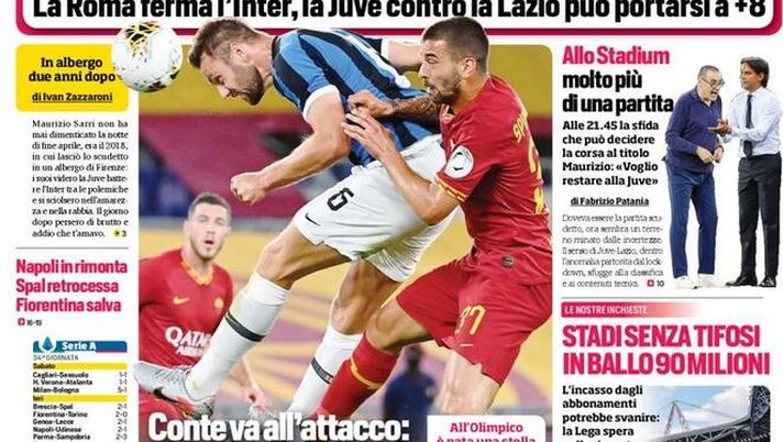 "Il quotidiano romano dedica la sua prima pagina alla goduria che, sicuramente, avrà provato Maurizio Sarri, tecnico della Juventus, nell'assistere, ieri sera, al pareggio per 2-2 tra Roma e Inter nel big match dello stadio 'Olimpico'. Un risultato che, di fatto, lancia la volata ai bianconeri nella lotta Scudetto: stasera, all'Allianz Stadium, in caso di vittoria contro la Lazio la 'Vecchia Signora' metterebbe una seria ipoteca sul titolo di Campione d'Italia.