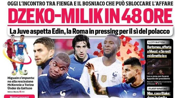 "Il 'Corriere dello Sport' oggi in edicola dedica la sua copertina al futuro di Edin Dzeko ed Arkadiusz Milik. Il bomber bosniaco potrebbe lasciare la Roma per andare alla Juventus: sarà decisivo l'incontro con il CEO giallorosso, Guido Fienga.