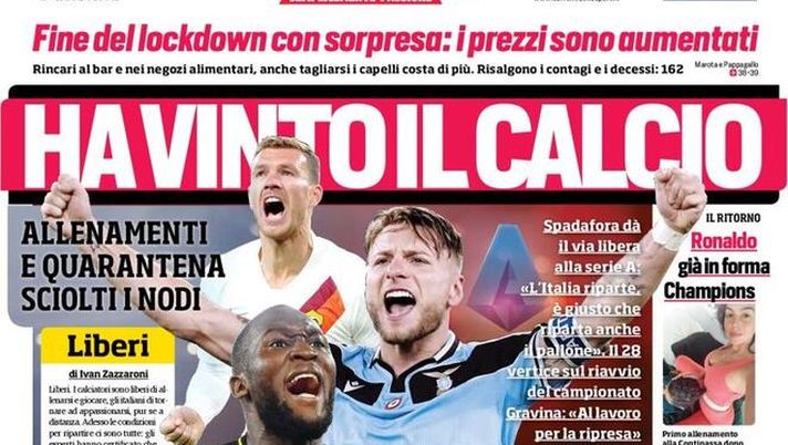 Il Corriere dello Sport si concentra quasi esclusivamente sul calcio, con riferimenti ai top club italiani principalmente. Gli allenamenti individuali sono ripresi, ma restano dubbi circa la ripresa di quelli collettivi. C'è dunque grande attenzione su questo tema, ma anche al calciomercato.