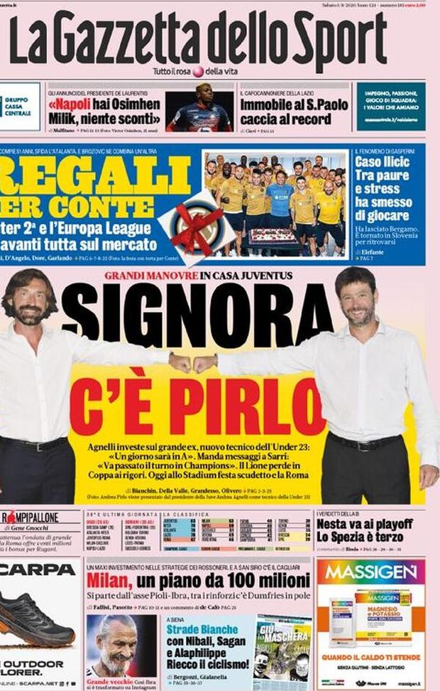 ULTIME NOTIZIE MILAN NEWS - Questa la prima pagina de 'La Gazzetta dello Sport', in edicola oggi, sabato 1 agosto 2020. Diamo un’occhiata alle principali novità sul mondo dello sport e in particolare del calcio, cercando di evidenziare le notizie sul Milan. In primo piano la presentazione di Andrea Pirlo come nuovo tecnico della Juventus Under 23. Intanto Elliott vuole spendere per portare il Milan in alto.