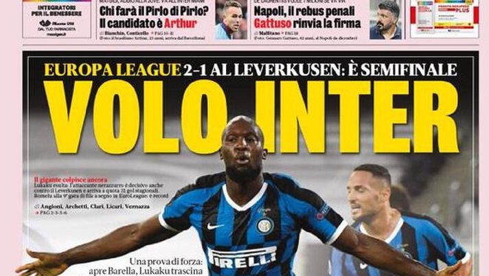 "'La Gazzetta dello Sport' ha dedicato la sua prima pagina all'Inter di Antonio Conte, che, dopo la vittoria per 2-1 a Düsseldorf contro il Bayer Leverkusen, si è qualificata per la semifinale di Europa League. Autentico mattatore della sfida l'attaccante belga Romelu Lukaku. Ora i nerazzurri attendono la vincente di Shakhtar Donetsk-Basilea.