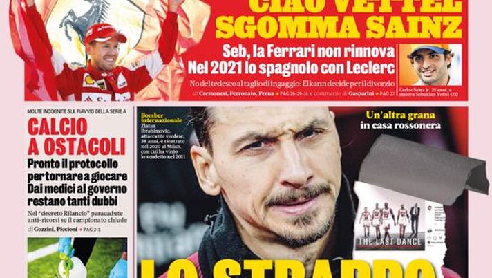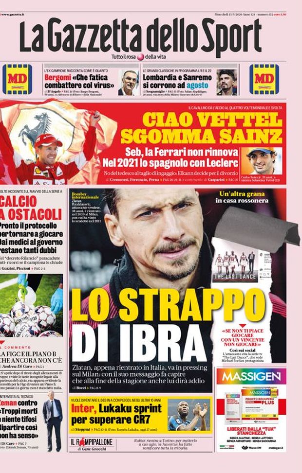 NEWS MILAN – Questa la prima pagina de 'La Gazzetta dello Sport', in edicola oggi, mercoledì 13 maggio 2020. Diamo un’occhiata alle principali novità sul mondo dello sport e in particolare del calcio, cercando di evidenziare le notizie sul Milan. In primo piano il futuro sempre più incerto di Zlatan Ibrahimovic: secondo la rosea il post pubblicato ieri sarebbe un chiaro messaggio nei confronti della società rossonera.