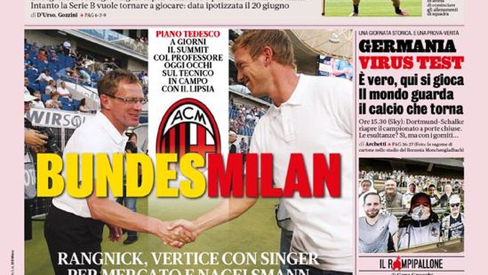 NEWS MILAN – Questa la prima pagina de 'La Gazzetta dello Sport', in edicola oggi, sabato 16 maggio 2020. Diamo un’occhiata alle principali novità sul mondo dello sport e in particolare del calcio, cercando di evidenziare le notizie sul Milan. Prima pagina della rosea dedicata - come ieri - all'arrivo al Milan di Ralf Rangnick, il quale - nonostante le secche smentite dalla Germania - potrebbe portare con sé Julian Nagelsmann, promettente tecnico del Lipsia.