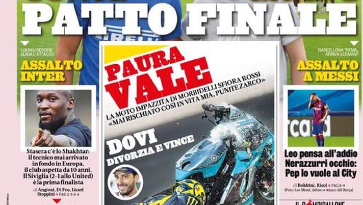 "'La Gazzetta dello Sport' dedica la sua copertina all'Inter che, questa sera, è impegnata contro lo Shakhtar Donetsk nella semifinale di Europa League: qualora vincessero, i nerazzurri accederebbero alla finale contro il Siviglia, che ieri ha battuto 2-1 il Manchester United. Patto tra Steven Zhang, Presidente dell'Inter, ed il tecnico Antonio Conte: tanto del futuro dell'allenatore passerà dal successo in questa competizione.