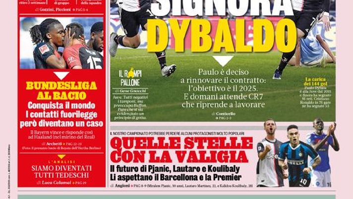 In primo piano troviamo l'argomento Juventus, con Paulo Dybala pronto al rinnovo di contratto fino al 2025, mentre Cristiano Ronaldo è atteso per la ripresa degli allenamenti. La Bundesliga riprende a giocare, ma ci sono diverse polemiche sui contatti inevitabili in campo tra i giocatori. In alto viene riportata una dichiarazione di Paolo Maldini che, ospite a 'Che Tempo Che Fa', rivendica il suo passato con la maglia del Milan. Intanto moltissimi big della Serie A sono con la valigia in mano e potrebbero lasciare i propri club.
