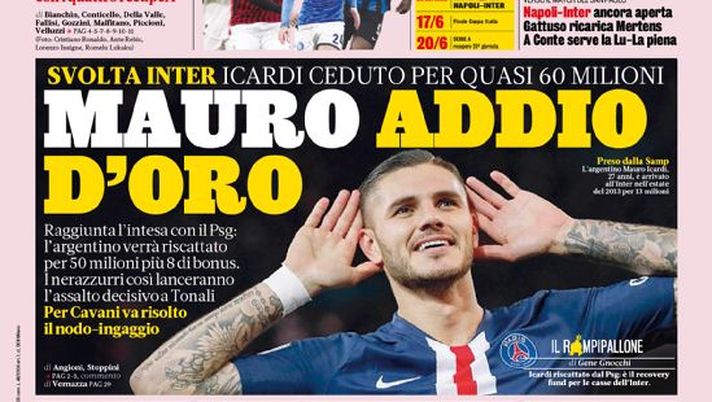 MILAN NEWS - Questa la prima pagina de 'La Gazzetta dello Sport', in edicola oggi, sabato 30 maggio 2020. Diamo un’occhiata alle principali novità sul mondo dello sport e in particolare del calcio, cercando di evidenziare le notizie sul Milan. In primo piano la cessione di Mauro Icardi dall'Inter al Psg e le semifinali di Coppa Italia, con i rossoneri che dovranno giocare a Torino contro la Juventus.