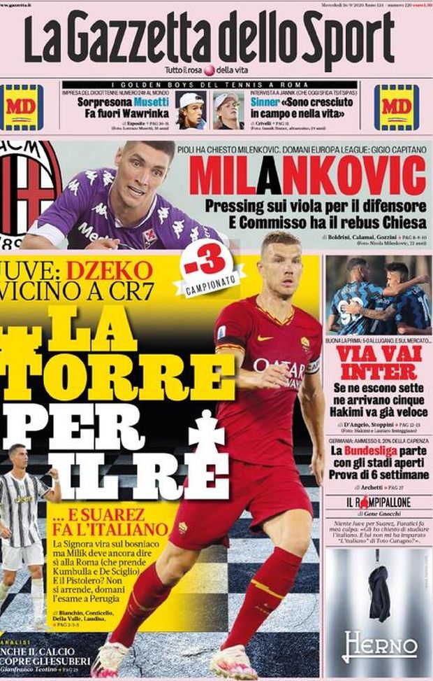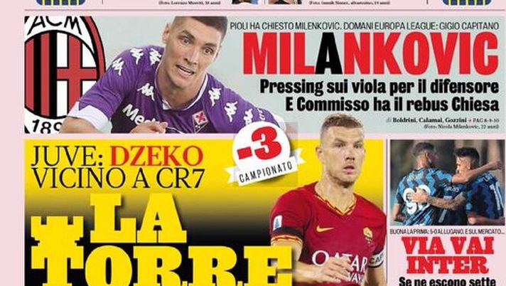 "'La Gazzetta dello Sport' dedica la sua pagina ad Edin Dzeko. Con tutta probabilità sarà il bosniaco il nuovo centravanti della Juventus. La Roma dovrebbe sostituirlo con Arkadiusz Milik, che, però, non ha ancora detto sì ai giallorossi. In arrivo nella Capitale anche Marash Kumbulla e Mattia De Sciglio.