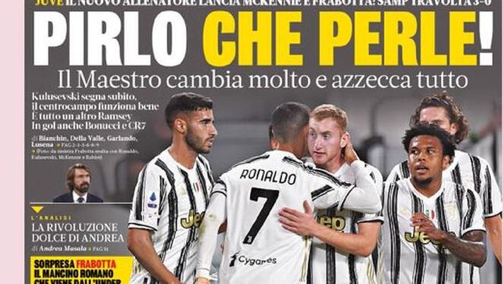 "'La Gazzetta dello Sport' in edicola questa mattina dedica la sua copertina alla prima Juventus di Andrea Pirlo, che ha battuto 3-0 la Sampdoria all'Allianz Stadium. L'allenatore ha lanciato Gianluca Frabotta e Weston McKennie titolari, ma la partita è stata decisa da Dejan Kulusevski, Leonardo Bonucci e Cristiano Ronaldo.