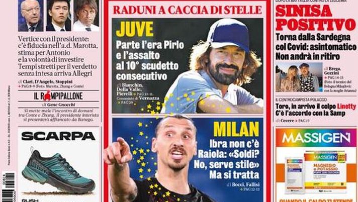 "I rossoneri saranno orfani di Zlatan Ibrahimović, il quale, comunque, tratta il rinnovo del suo contratto. Per l'agente Mino Raiola, non è una questione di soldi, ma di 'stile'. Infine, nel riquadro verticale, si parla di Siniša Mihajlović, tecnico del Bologna, trovato positivo al coronavirus e del colpo di mercato del Torino, che ha acquistato Karol Linetty dalla Sampdoria.