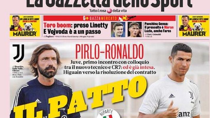 "'La Gazzetta dello Sport' in edicola questa mattina divide equamente la sua prima pagina tra Juventus ed Inter. Patto tra Andrea Pirlo e Cristiano Ronaldo per il futuro dei bianconeri, mentre Gonzalo Higuaín va verso la rescissione del contratto.