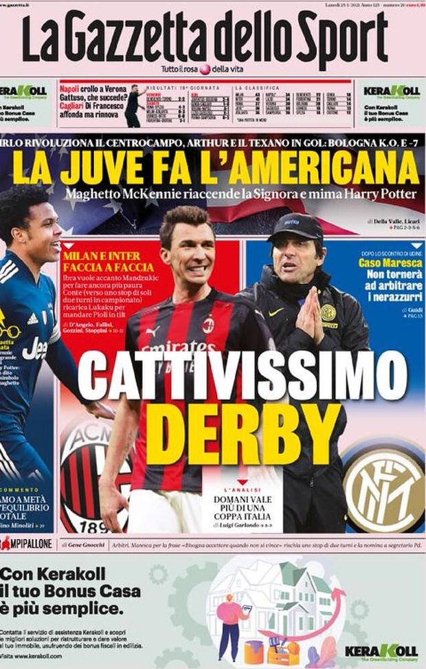 GAZZETTA DELLO SPORT – La prima pagina di oggi, 25 gennaio 2021